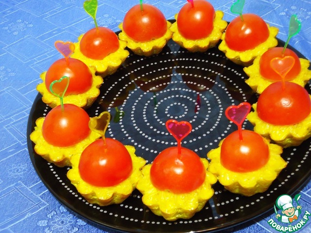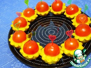 Вынимаем башенки из риса и украшаем их половинками помидоров черри.