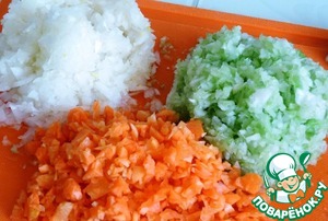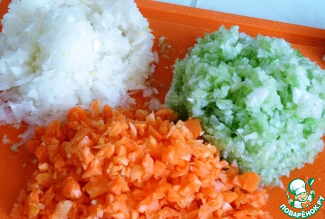 Овощи вымыть, почистить и нарезать мелким кубиком. Мне больше нравится для этого блюда овощи измельчать в блендере.