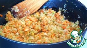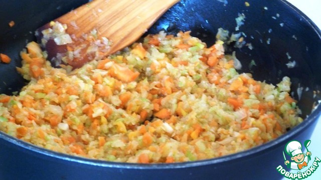 Обжарить сначала лук и чеснок. Чеснок можно нарезать или пропустить через пресс. Добавить морковь и сельдерей.