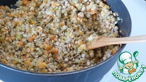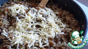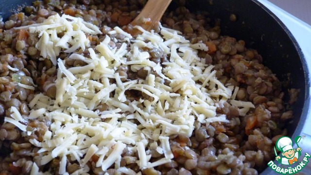 Добавить натертый сыр, вмешать в чечевицу. Сначала будут видны сырные ниточки, а потом сама чечевица посветлеет.