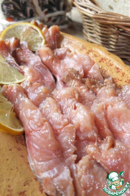 От тонких частей хвоста острым ножом нарезаем тонкие пластинки наискось.