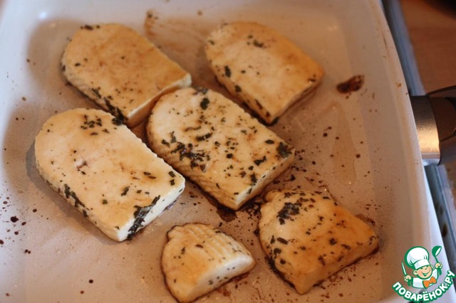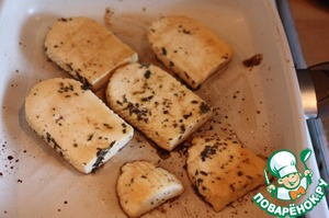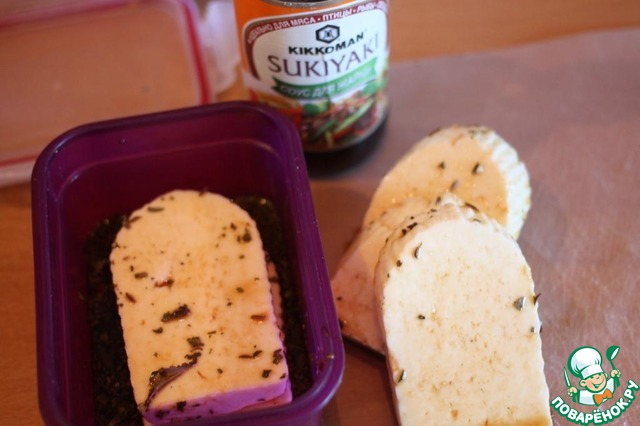 Сыр обмазать получившимся маринадом, положить в контейнер на 15-20 минут, периодически переворачивая.