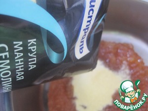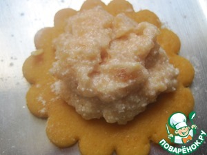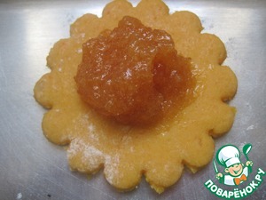 Меньшую половину кладем на противень, посередине повидло с манкой.