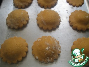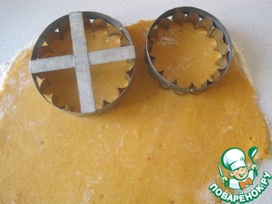 Тесто раскатываем толщиной 3 мм, выемками 2 размеровли стаканами) вырезаем кружки