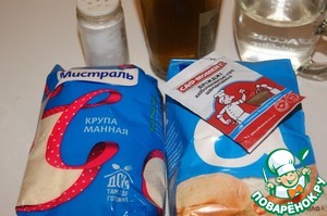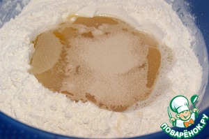 Смешать вместе манку и муку. Собрать горкой и, сделав в центре кратер, влить в него теплую воду. Добавить в воду соль, масло и дрожжи.
