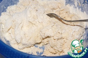 И вилкой, как советует шеф, начать замешить тесто, как можно меньше прикасаясь в нему руками. Когда это уже будет невозможно, домесить тесто руками, месить долго. Я добавила всего 1 ст. л. муки при замесе.