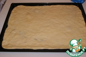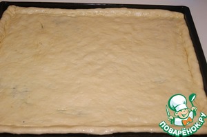Противень смазать маслом и расправить на нем тесто руками. Тесто очень послушное, и сделать это легко и просто.