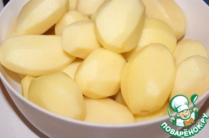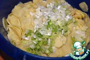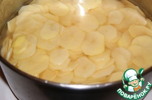 Картофель нарезать очень тонкими кружочками 1,5-2 мм. В воде комнатной температуры растворить соль и замочить в ней картофель на 1,5 часа.