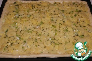 Равномерно распределить картофель поверх теста и слегка посыпать розмарином. Если вместо розмарина используете укроп, то лучше его смешать с картофелем.