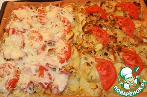 Готовую пиццу разрезать на 2 части. Поверх картофеля выстелить тонко нарезанные помидоры. На одну из частей выстелить бекон и посыпать сыром.