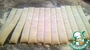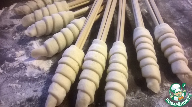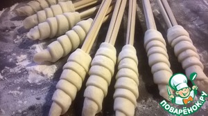 Каждую полоску немного раскатать и обернуть ею 3 палочки для суши (если нет специальных приспособлений)