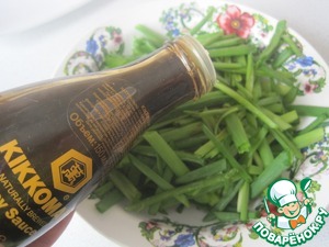 Зеленый лук режем на перья длиной 3-4 см, поливаем соевым соусом, оставляем на 30 мин. Лук размягчается, приобретает легкую горчинку соевого соуса.