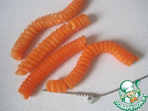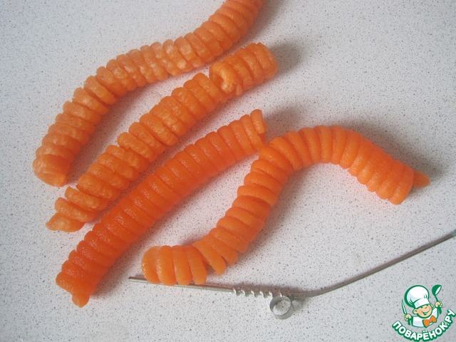 Морковь режем тонкой соломкой, но мои дети любят сам процесс вырезания спиралек из овощей и я при помощи приспособления вырезала завитушки.