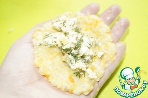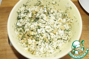 Для начинки: сыр натереть на мелкой терке, добавить мелко нарубленное яйцо и зелень укропа, посолить.