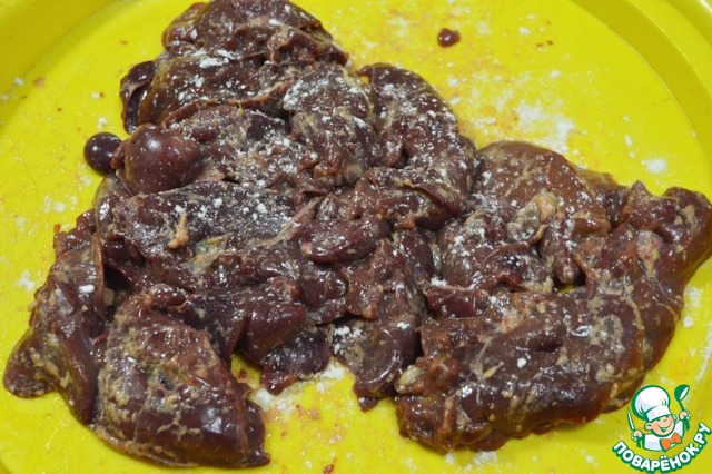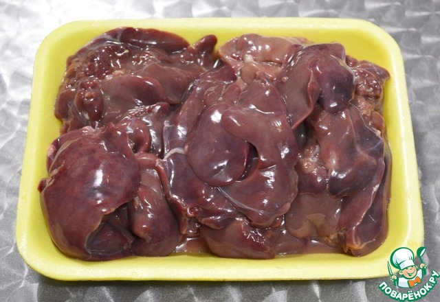 Начнём с того, что почистим и помоем полкило куриной печени. Разрежем её на большие кусочки, разложим на блюде в один слой и время от времени будем переворачивать чтобы подсохла.