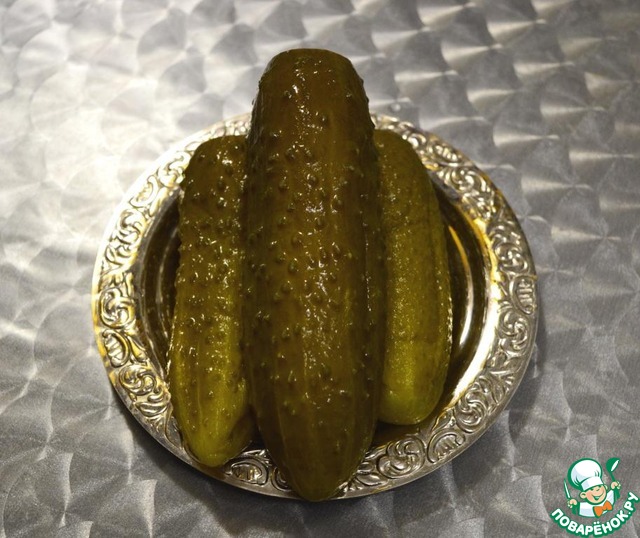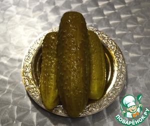 Три небольших маринованных огурчика режем тонкими полукольцами и отправляем вслед за помидорками.