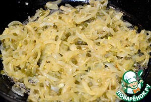 Далее режем лук тонкими полукольцами и отправляем на сковороду с разогретым растительным маслом.