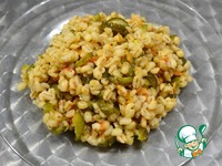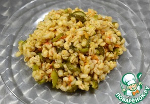 Немного перчика чили мелко режем и туда же. Соль добавляйте с осторожностью, так как помидоры с огурцами уже слегка подсолили перловку. Подлейте немного растительного масла, перемешайте. Пусть теперь варится до тех пор, пока не пропищит мультиварка.
