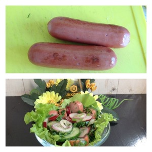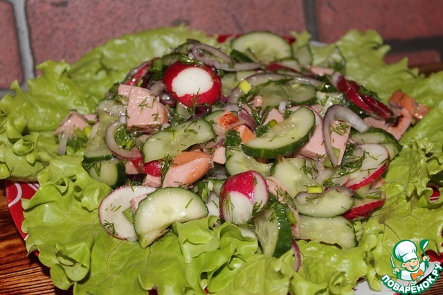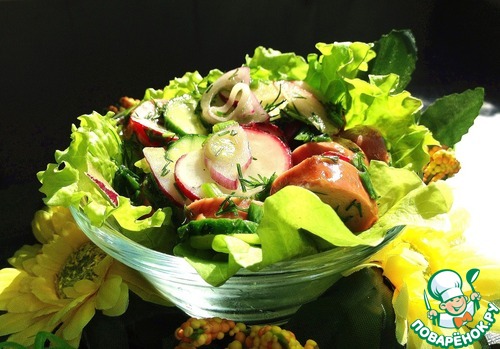 • Сосиски поджарить на сухой сковороде и нарезать колечками, добавить к салату и перемешать. На тарелку выложить листья салата и сам салат.