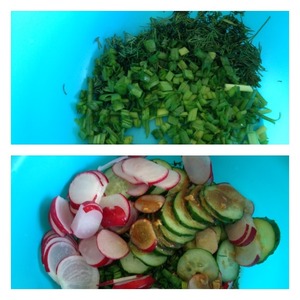 • Зеленый лук и укроп нашинковать. Редис и огурец нарезать кольцами.