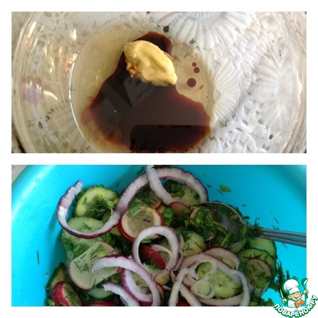 • Сделать заправку: масло смешать с соевым соусом и горчицей, перемешать. Красный лук тонко нарезать кольцами и добавить к салату. Влить нашу заправку и салат перемешать.