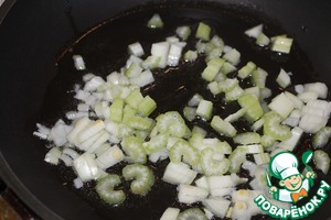 Лук и сельдерей порезать не слишком мелко. Обжаривать на оливковом масле, помешивая четыре минуты.