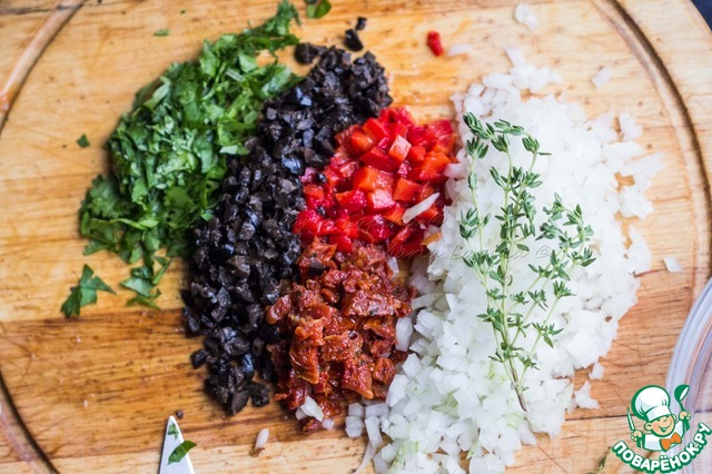 Лук, оливки, зелень, вяленные томаты и болгарский перец мелко порежем. С веточек тимьяна снимем листики.