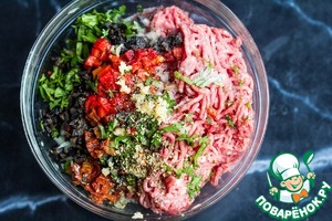 Смешаем фарш и нарезанные продукты.