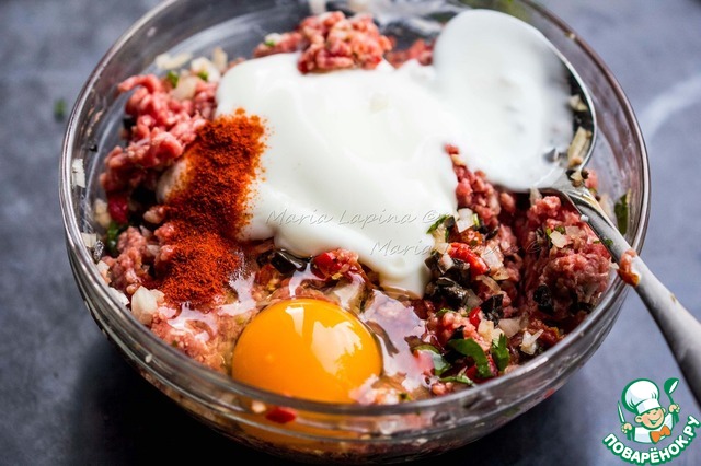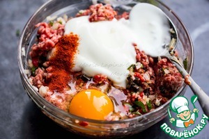 Добавим яйцо, йогурт и паприку. Вымешаем фарш.