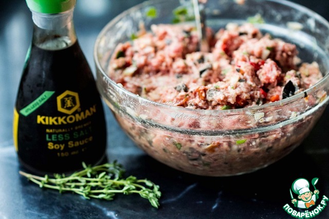 Добавим соевый соус, смесь перцев и немного соли. Фарш хорошенько помнем руками, отобьем. Чтобы насытить фарш кислородом поднимаем его и бросаем в миску. Так фарш станет более воздушным.