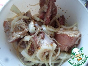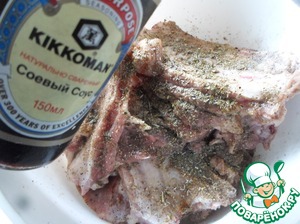 Мясо (у меня ребра и не много мякоти) режем на куски. Добавляем все специи и соевый соус, перемешиваем.