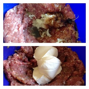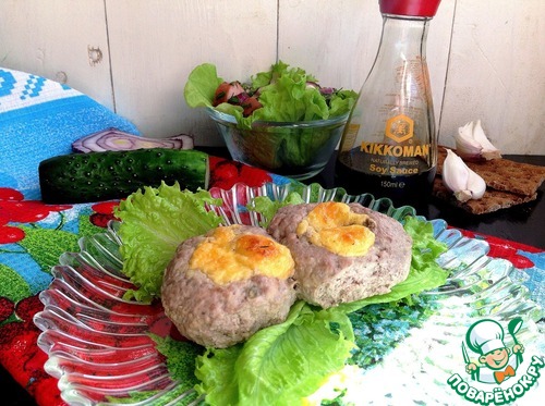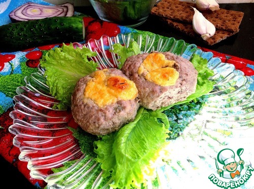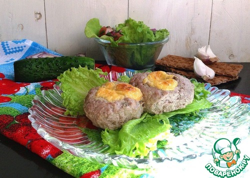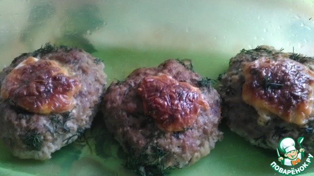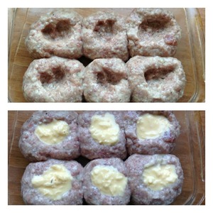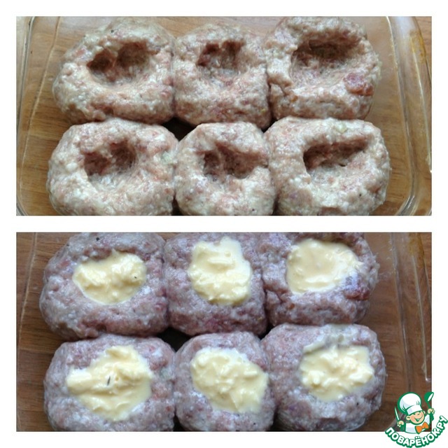 Подготовить форму для запекания, ничем не смазывать. Котлеты дадут свой сок и будут запекаться в нем. Влажными руками сформировать круглые котлеты. С размером определяйтесь сами. Котлеты выложить в форму для запекания и пальцами в центре котлет сделать углубления-отверстия. Чайной ложкой в эти отверстия выложить заливку. Отправить котлеты в духовку при 180 гр на 30-40 минут.