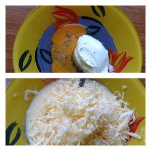 Сделать заливку: взбить яйцо, сметану и соль. Натереть на средней терке сыр. Все перемешать.
