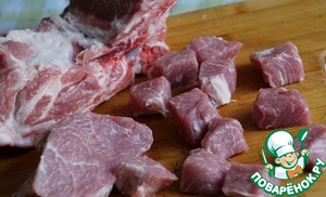 Мясо нарезаем маленькими кубиками - размером с крупный орех фундук.