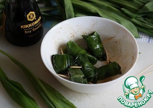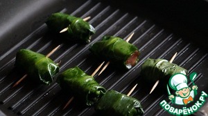 На листик выкладываем замаринованное мясо, заворачиваем и закрепляем зубочисткой. -