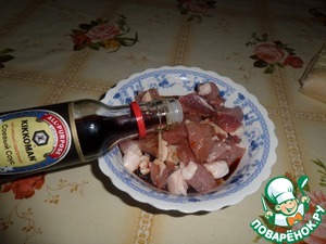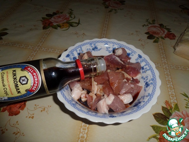 Мясо нарезаем кубиком. Кладем в чашку и добавляем любимый соевый соус ТМ "Kikkoman". Перемешиваем и оставляем на 30 минут.