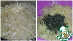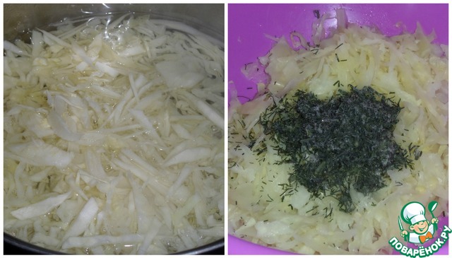 Капусту отварить в течении 3-5 минут в подсоленной кипящей воде. Откинуть на дуршлаг и обдать холодной водой. Выложить в чашку и добавить укроп ( у меня замороженная зелень).