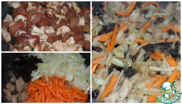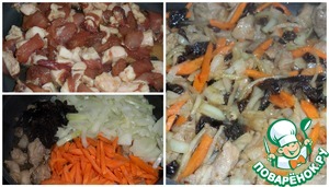 В глубокую сковороду наливаем растительное масло, выкладываем мясо и обжариваем 10 минут. Затем добавляем морковь, лук и чернослив. Обжариваем 15 минут. Немного остужаем.