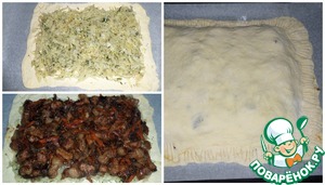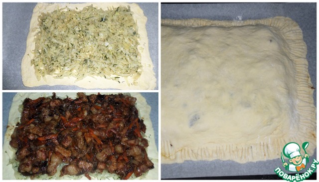 Тесто раскатываем на 2 прямоугольника. Выкладываем 1 пласт теста на противень. На тесто выкладываем капусту с укропом, поверх нее - мясо с овощами и черносливом. Накрываем 2 пластом теста. Прижимаем края, я сделала это вилкой. Накрываем полотенцем и оставляем на 20-30 минут в теплом месте.