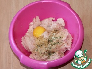 2. В куриный фарш добавить яйцо, приправу для курицы и перемешать.