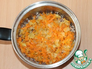 5. Затем овощи выложить в кастрюлю с гречкой, посолить, поперчить и перемешать. Постная начинка готова!