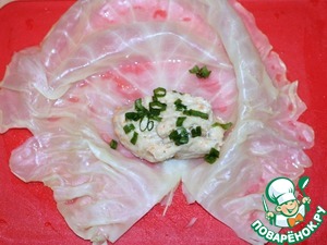8. На другую часть капустных листьев выкладываем куриный фарш с гречкой и овощами...