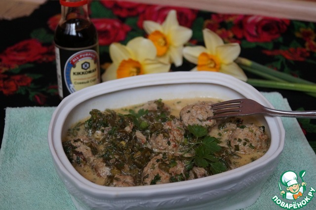 "Весенними" я назвала эти фрикадельки потому, что в них очень много зелени, а значит витаминов, которых нам так не хватает весной. Дополняет их пикантный соус, сметано - горчичный с щавелем и соевым соусом. В целом очень вкусное блюдо, которое можно подать как самостоятельное и с гарниром.
