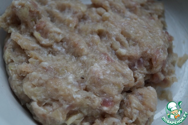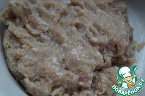 Свинину, куриную грудку и репчатый лук пропустить через мясорубку.