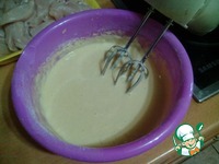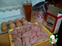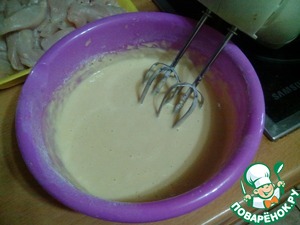 Взбиваем вместе яйца, пиво, соду, муку (примерно 2 стакана) и соль-специи (по желанию). Тесто по консистенции должно напоминать густую сметану. |