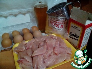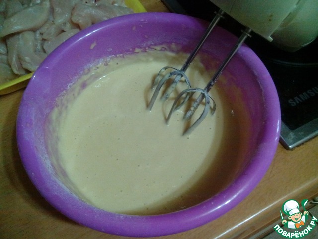 Взбиваем вместе яйца, пиво, соду, муку (примерно 2 стакана) и соль-специи (по желанию). Тесто по консистенции должно напоминать густую сметану.