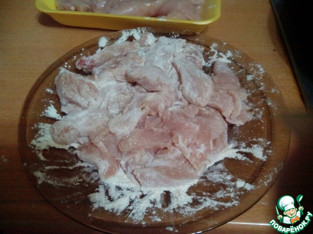 Куриное мясо нарезаем полосками 1,5-2,5 см. -