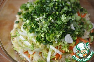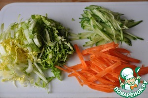 Тонкими полосками режем пекинскую капусту.