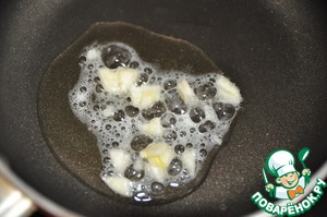 На растительном масле обжариваем мелкорубленный чеснок до появления лёгкого аромата.