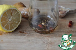В небольшую баночку наливаем арахисовое масло (можете взять оливковое), добавляем сахар, соевый соус, натёртые на мелкую тёрку чеснок и корень имбиря, сок лайма (или лимона), хлопья перца чили.